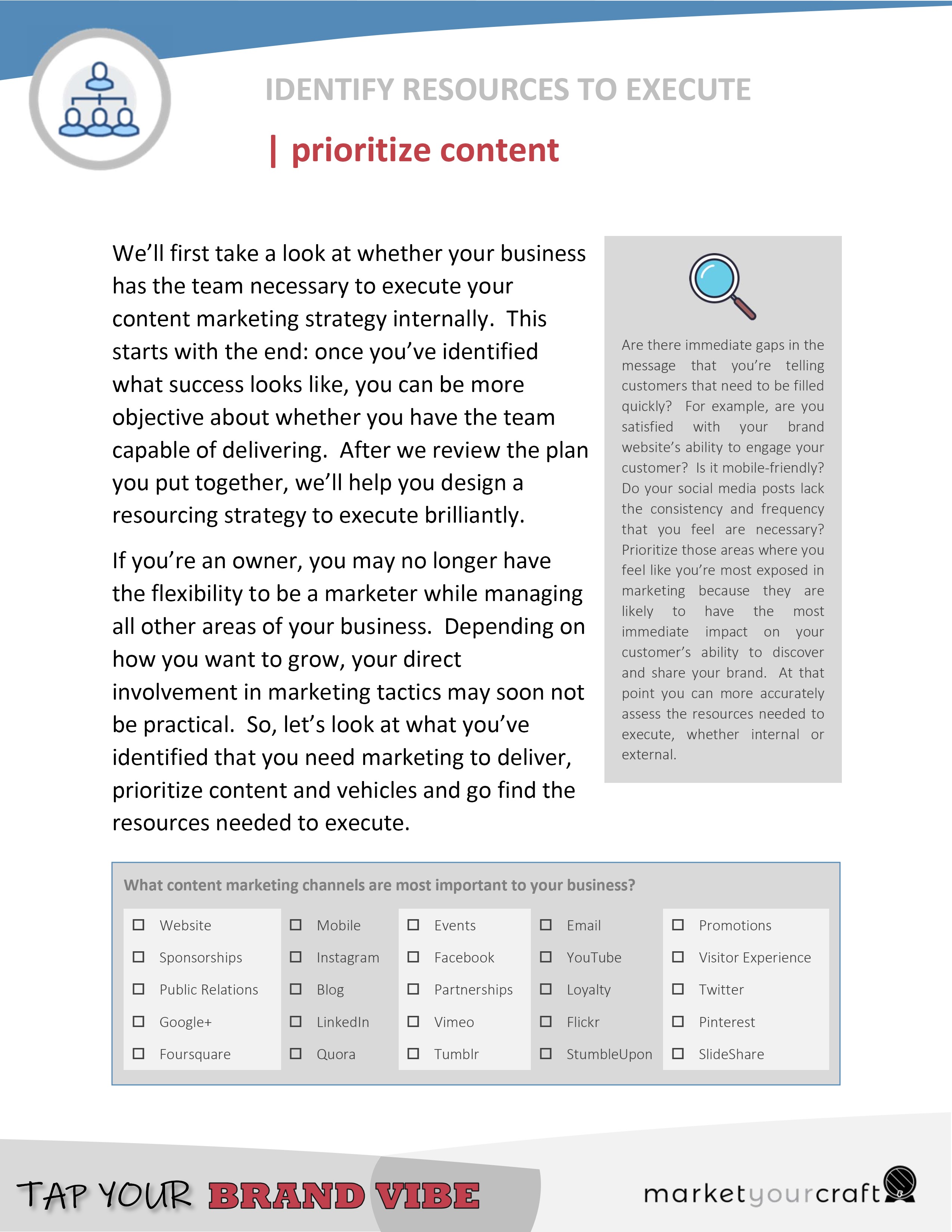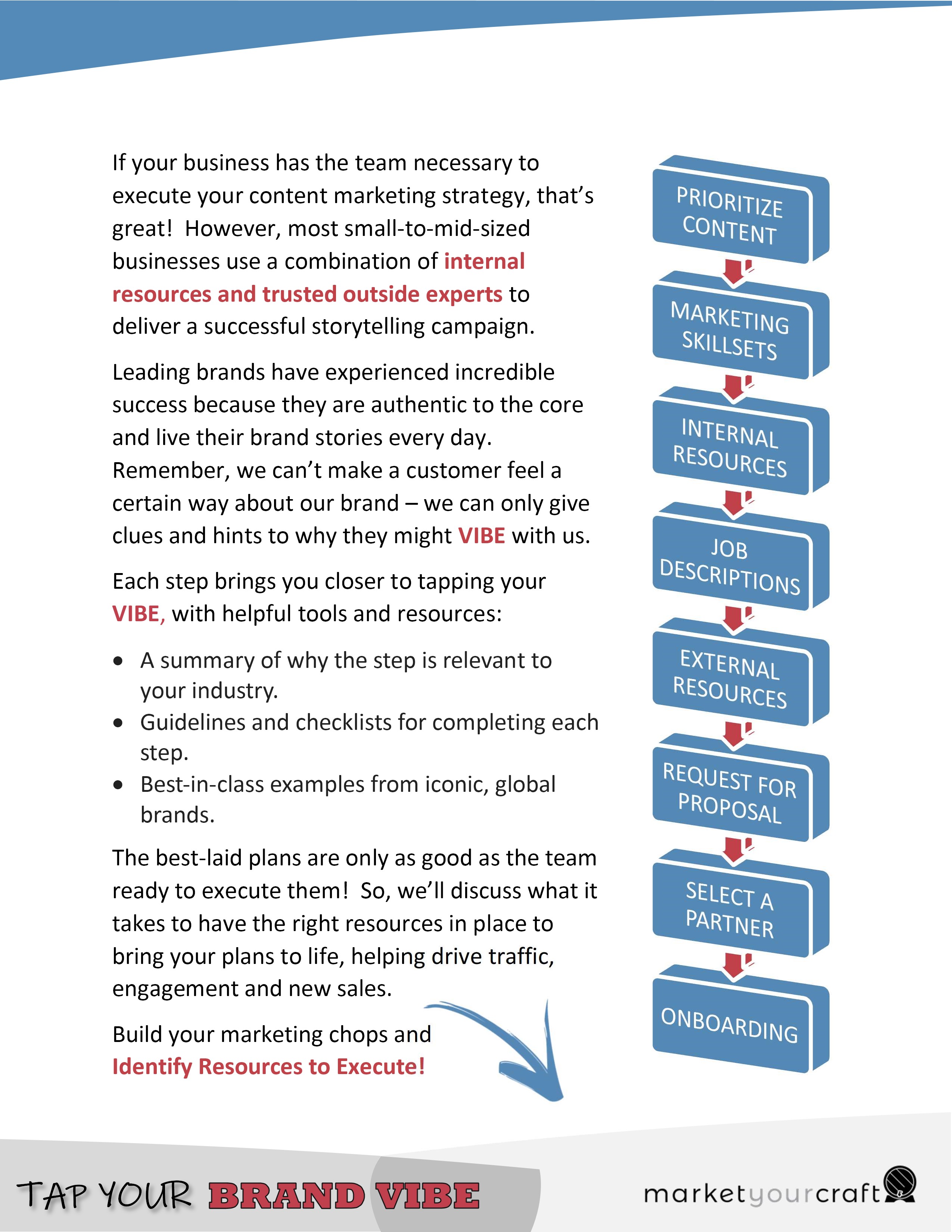 Let’s design a successful resourcing strategy, helping you build long-term relationships with your customers through consistent communications. The sixth and final module in the BRAND VIBE Workshop provides an objective audit of the needed versus available resources to bring your marketing strategies to life brilliantly.